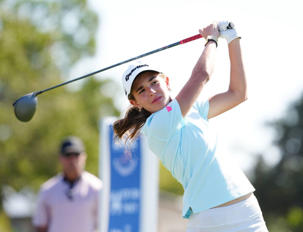 BELLEAIR, FL - NOVEMBER 14: University of Miami commit Kai Trump plays her tee shot on the 14th hole during The Annika driven by Gainbridge at Pelican on November 14, 2025, at the Pelican Golf Club in Belleair, Florida. Photo by Brian Spurlock/Icon Sportswire. GOLF: NOV 14 LPGA, Golf Damen The ANNIKA EDITORIAL USE ONLY Icon2511145